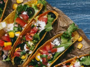 Close-up of freshly prepared hard-shell tacos filled with lettuce, tomatoes, black olives, corn, and a drizzle of cream, representing the appetizing dining options available to residents at Cedar Crest retirement community